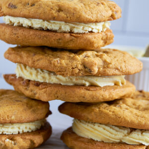 The Ultimate Cookie Sandwich! Indulge in the perfect combination of our oversized chocolate chip or oatmeal raisin cookies, lovingly sandwiched together with a generous layer of rich, creamy buttercream filling.